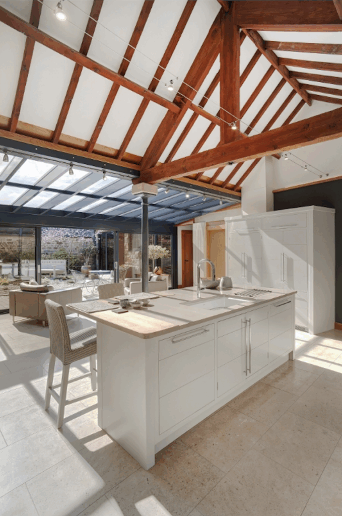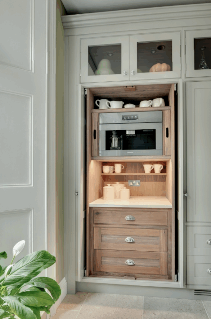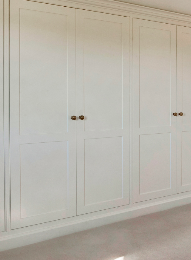 Elegant in-frame shaker wardrobes, hand-painted in a warm neutral, with oak interiors and open shelving for a serene retreat.