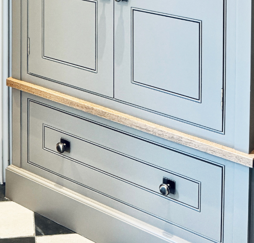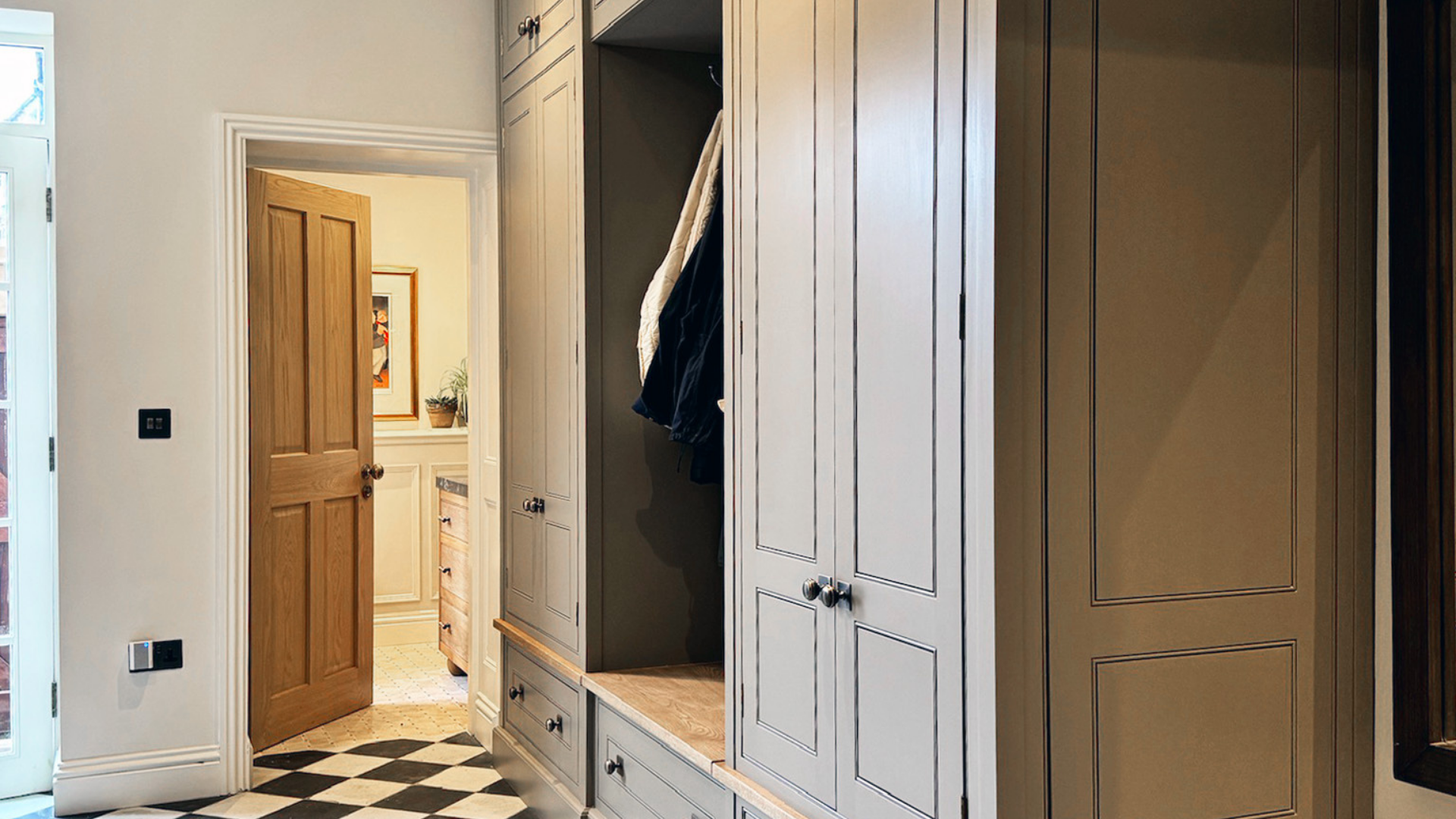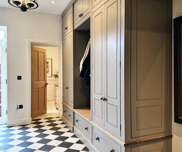 The Alston project boot room features in-frame staff bead cabinetry in a beaded shaker style, hand-painted in Farrow & Ball ‘Mouse’s Back’ with interiors finished in oak veneer. Crafted with precision and proportion, this beautifully detailed space elevates everyday function into timeless form.