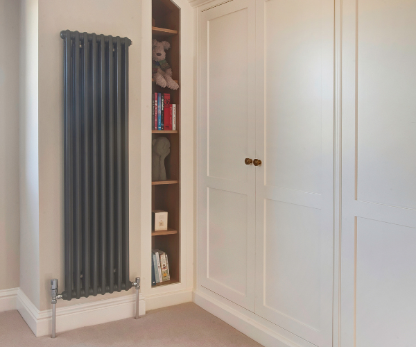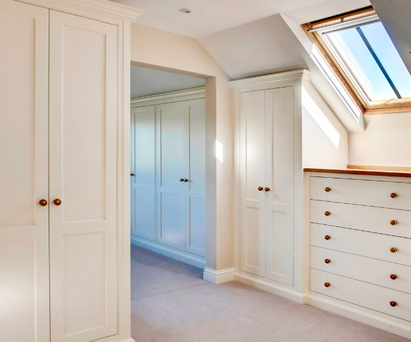 A serene retreat defined by in-frame staff bead shaker cabinetry, hand-painted in Farrow & Ball ‘Pointing’. The warm neutral hue enhances the room’s calm, natural light while oak interiors lend depth and texture. Open shelving provides display for books, fragrances and personal touches.