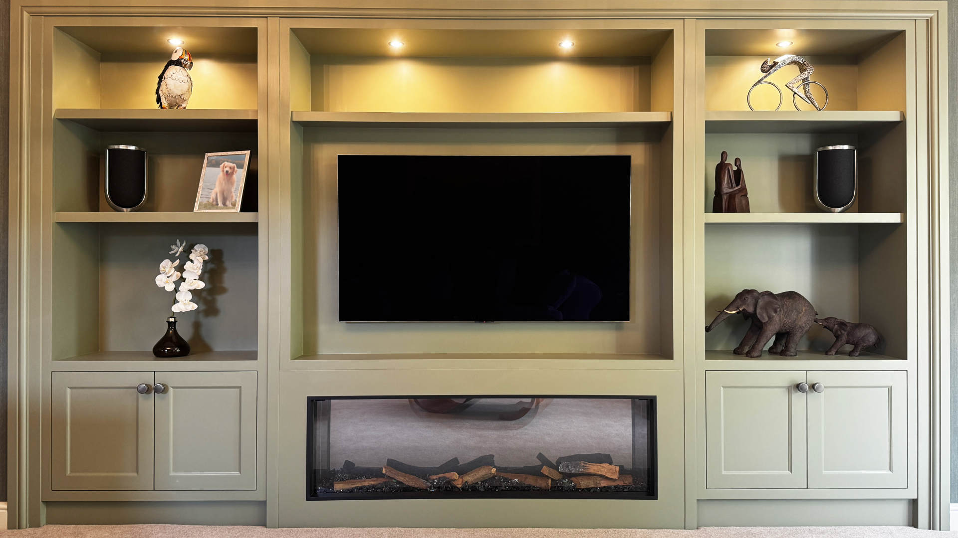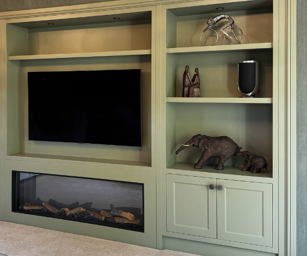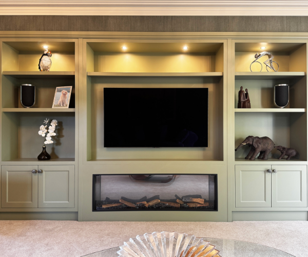 Sophisticated and seamlessly integrated, the Lanchester project media wall combines in-frame shaker cabinetry with a lamb’s tongue detail, finished in Farrow & Ball ‘Treron’. The muted green tone provides a calm, grounding backdrop for both entertainment and display. Centred around a Gazco ‘eReflex’ LED electric fire, the design balances symmetry and function,