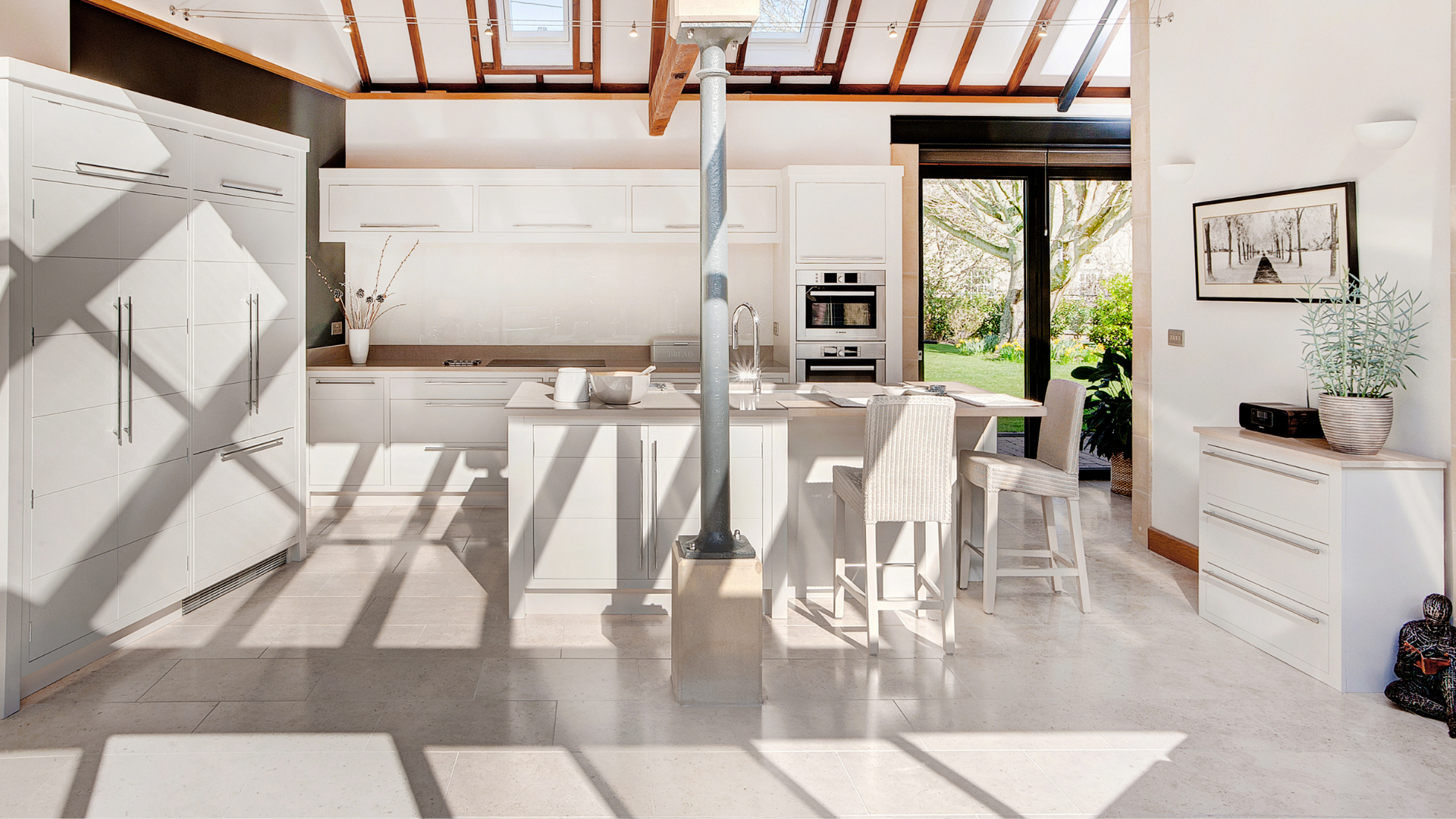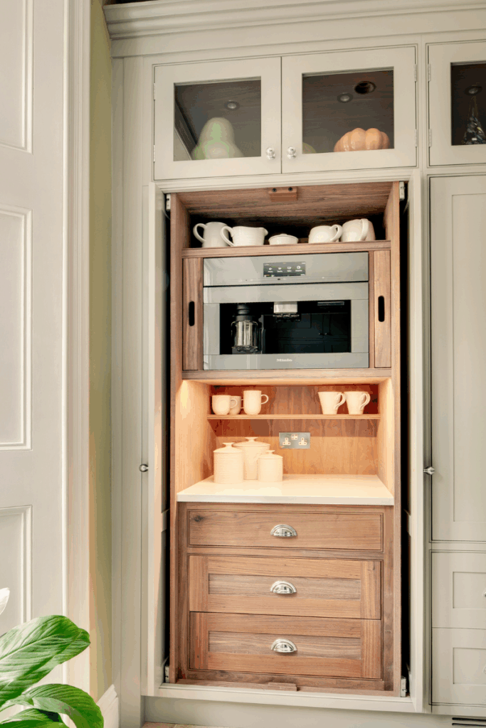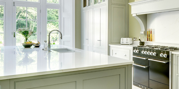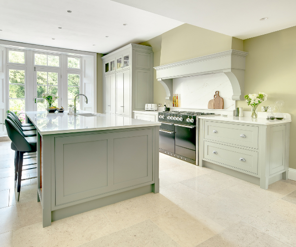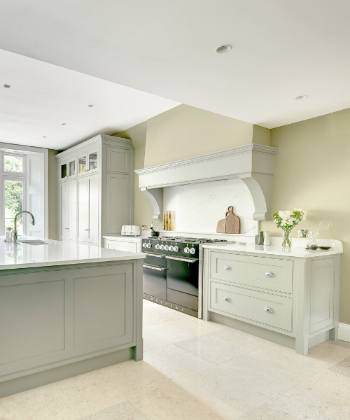 Flooded with natural light and defined by quiet elegance, The Elterwater project is a timeless composition of proportion and poise. The in-frame staff bead shaker cabinetry, hand-painted in Farrow & Ball ‘Lamp Room Grey’ with a contrasting island in ‘Plummett’, sets a calm, tonal palette that feels both classic and contemporary.
