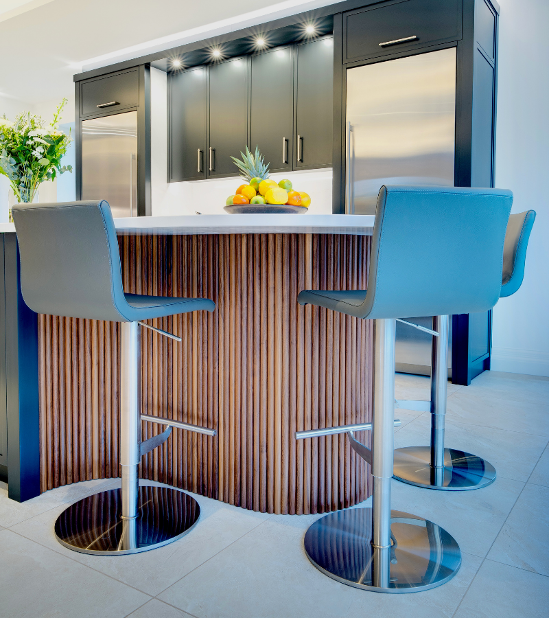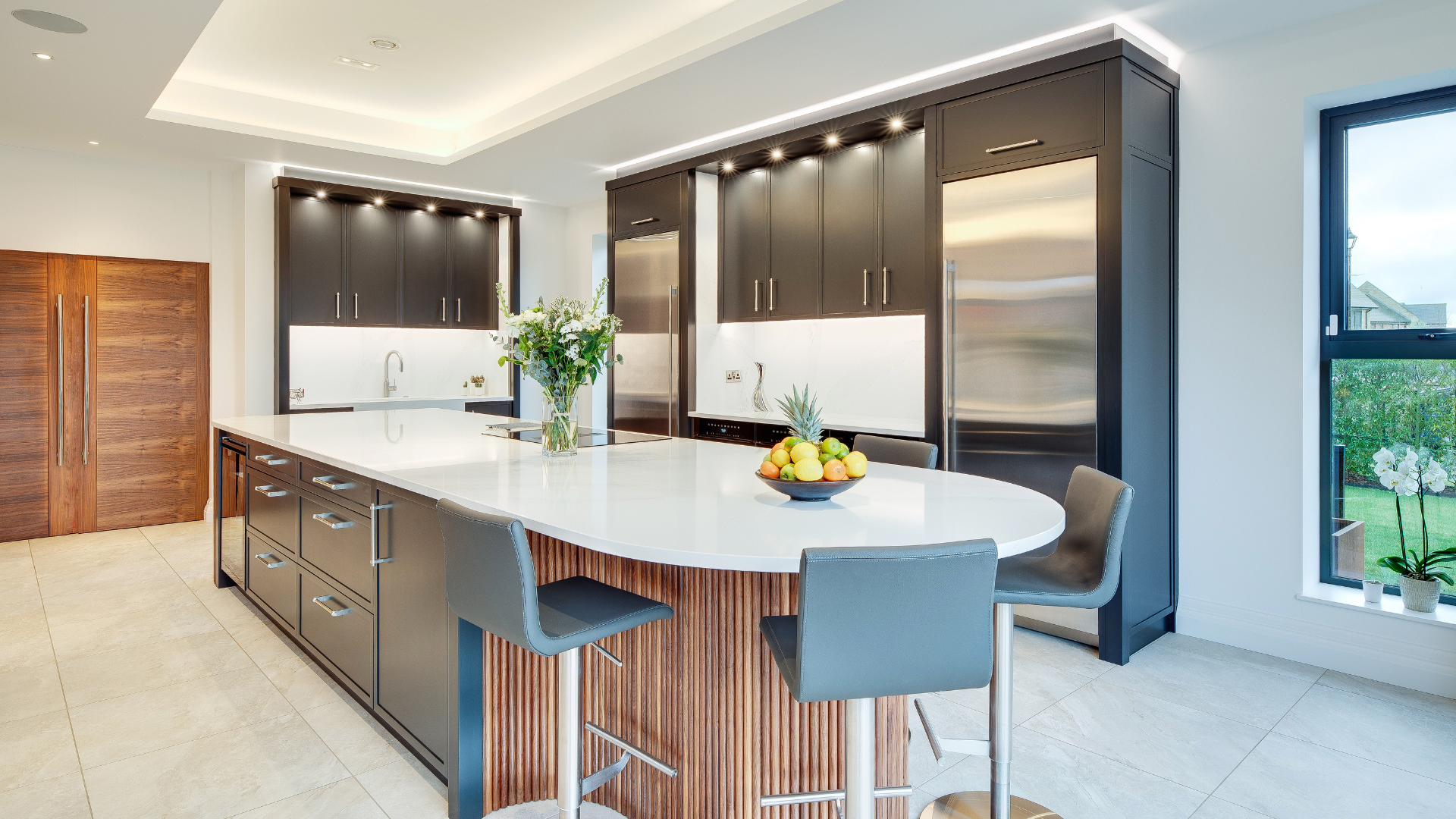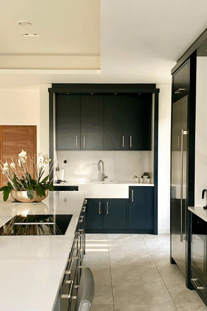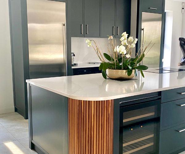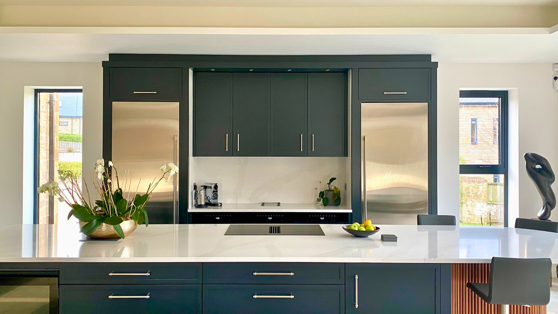 Richly detailed and effortlessly contemporary, the Morland project pairs bold contrast with refined simplicity. The lay-on skinny shaker cabinetry, hand-painted in Farrow & Ball ‘Off Black’, creates a quietly dramatic backdrop for the softly veined Silestone ‘Et Calacatta Gold’ worktops and splashbacks. This is Alexander Carrick craftsmanship distilled into a confident contemporary form.