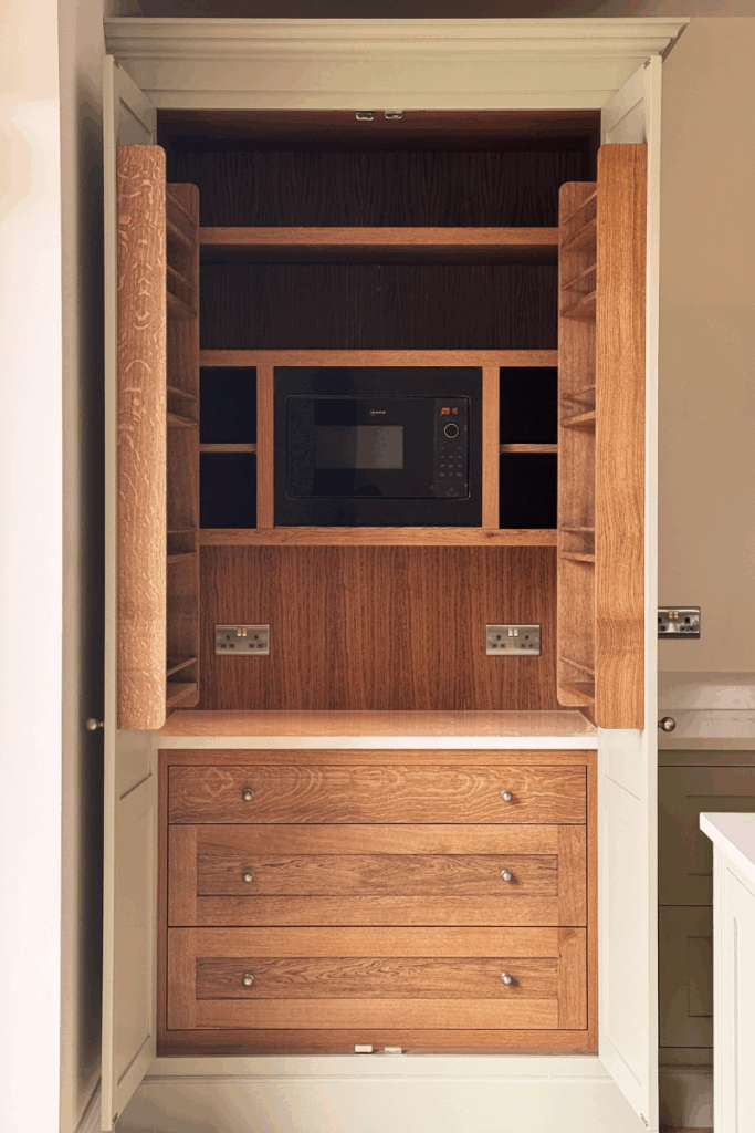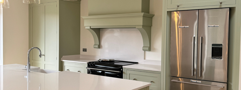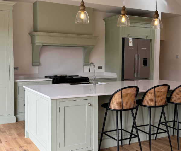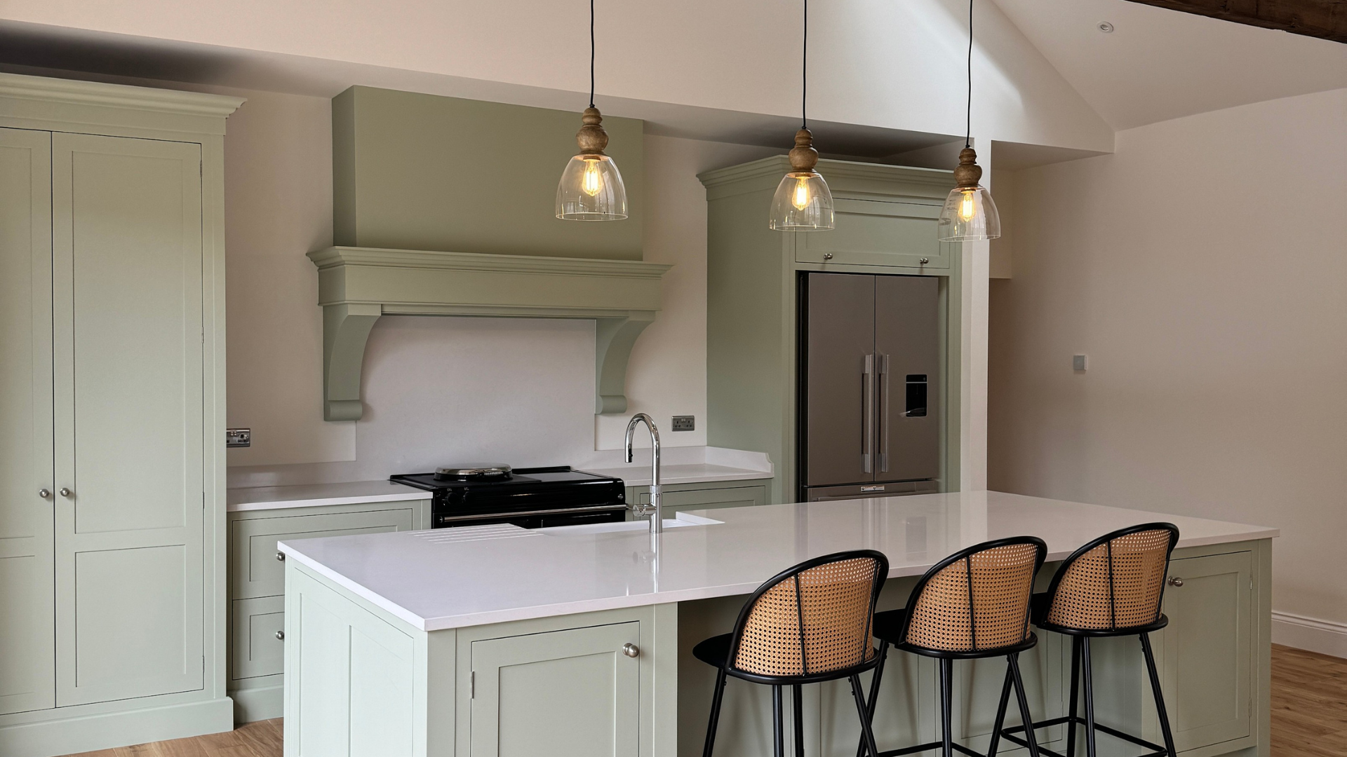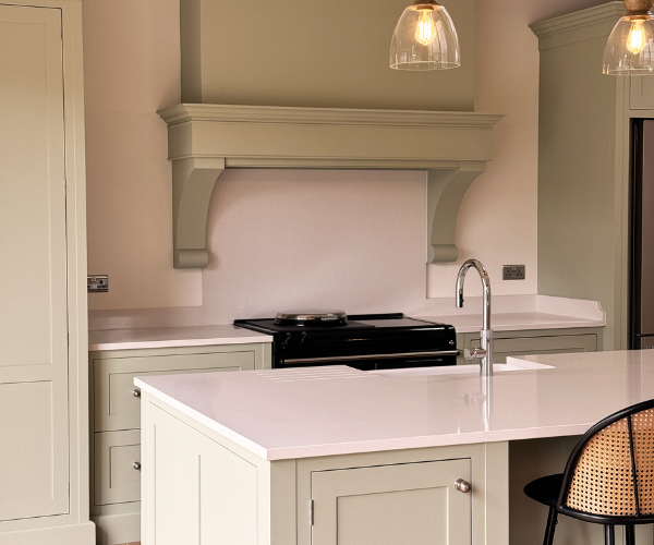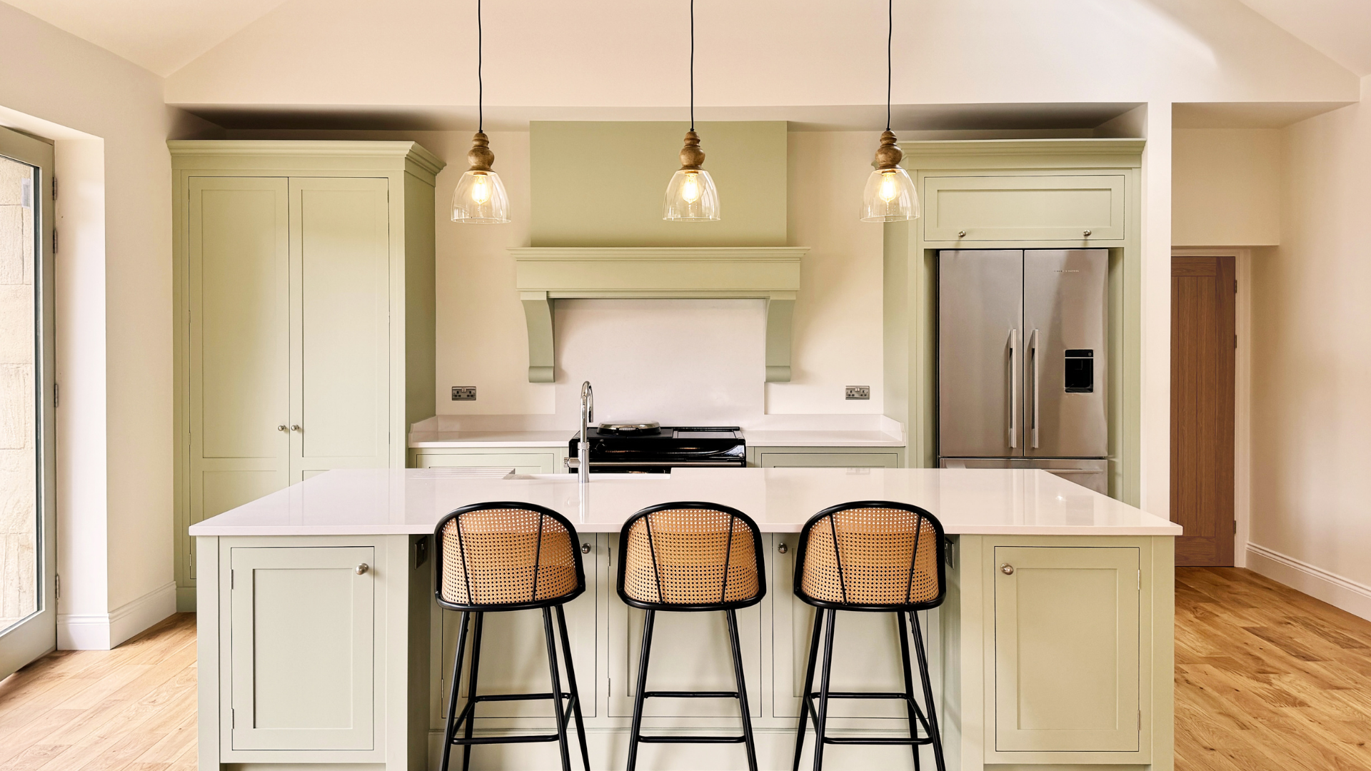 The Pickering project embodies natural warmth and quiet confidence and feels effortlessly at ease in its rural setting. The in-frame shaker cabinetry, hand-painted in Farrow & Ball ‘Vert de Terre’, balanced by Silestone ‘Miami Vena’ worktops and splashbacks – polished to a soft, luminous sheen – combine to create a celebration of proportion and natural tone.